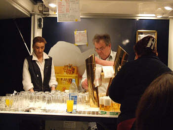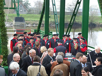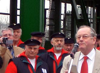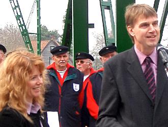 Bevor sich die Fähre zu ihrem ofiziellen Neustart in Bewegung setzte, dankte Horst Ahlf - Gründer und seit über 30 Jahren Vorsitzender der Fördergesellschaft zur Erhaltung der Schwebefähre - allen Mitgliederung und Spendern für ihre Hilfe und verkündete die "gute Nachricht", dass Sponsoren drei Faß Freibier für das Fest gestiftet haben.