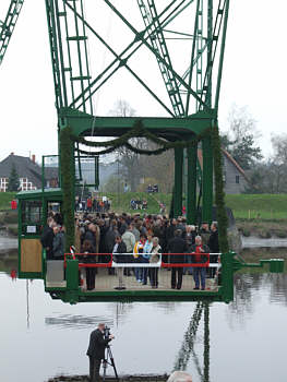 Nach mehr als vierjährigem Kampf um die Wiederinbetriebnahme setzte sich um 11.57 Uhr bei strahlendem Sonnenschein die Schwebefähre, die mancher schon abgeschrieben hatte, wieder in Bewegung.