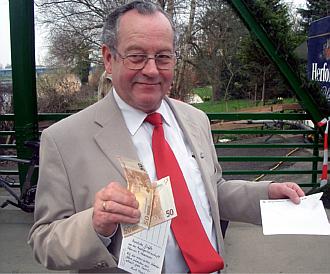 ... empfing Horst Ahlf ein weiteres Signal dafür, dass die Fähre Verbindungen schafft: Für die "Bootsgemeinschaft Fährstraße 9" in Hemmoor hatte Vorsitzender Kurt Meyer der Fähre "allzeit gute Fahrt" gewünscht und 100 Euro gespendet.