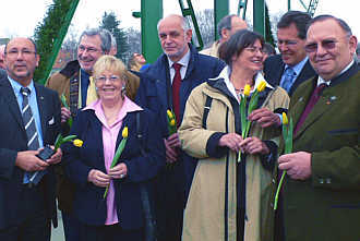 Besonders ging der Bürgermeister auf die Gemeindepartnerschaft mit dem Schwebefähren-Ort Osterrönfeld und auf die Zusammenarbeit mit Rendsburg ein; beide Kommunen waren mit einer vierköpfigen Delegation beim Festakt vertreten.