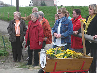 Bei der Einweihungsfahrt wurden die Gäste in Hemmoor mit einem Transparent begrüßt und von einem Empfangskomitee mit Frühlingsblumen überrascht .