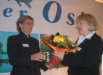 Mit einem Blumenstrauß begrüßte Osteland-Vorstandsmitglied Sigrid Frömming die Glückstädter Elbfähr-Gesellschafterin Hildegard Both-Walberg, die vor kurzem als 100. Mitglied dem gemeinnützigen Verein beigetreten war. Noch während der Festveranstaltung schnellte die Mitgliederzahl der AG Osteland auf 120 empor.