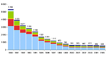 ![]() Schwefeldioxid-Mittelwerte 1985 bis 2004: vergrößern Diese Schaubilder des Umweltbundesamtes illustrieren einen der größten Erfolge der deutschen Umweltbewegung: Unter dem Druck der Proteste gegen Waldsterben und Luftverschmutzung zwangen die Regierenden die Industrie, ihre Abgase zu entschwefeln. ![]() Schwefeldioxid-Emissionen nach Quellen: vergrößern Der Niedergang der umweltvergiftenden DDR-Kraftwerke nach der Wiedervereinigung tat ein Übriges, um die Emission von Schwefeldioxid zu reduzieren.